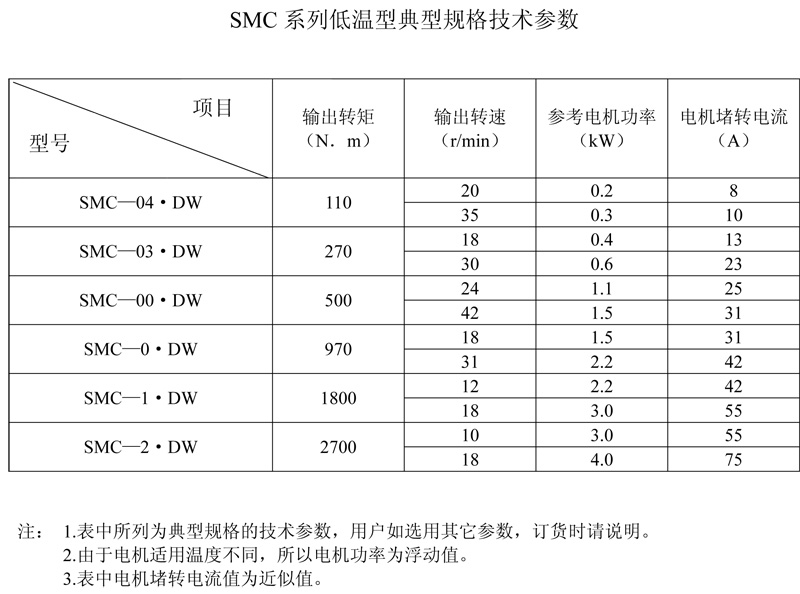 SMC系列低溫型閥門電動裝置是在其普通型的基礎上,對主箱體等受力零件的材料,電控器件和導線的材料,橡膠密封件的材料,潤滑脂,電動機的性能和功率選用等均采取了相應措施,以達到產(chǎn)品應具備的低溫性能。該系列產(chǎn)品連接尺寸及外形尺寸均與SMC系列各尺寸相同。