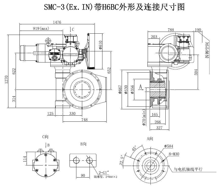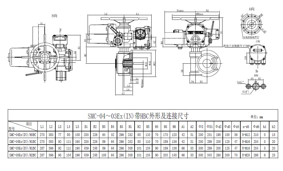 SMC/HBC系列電動裝置是SMC系列多回轉電動裝置與HBC蝸輪減速器的組合型式,它適合球閥、蝶閥等部分回轉閥門的驅(qū)動控制。SMC/HBC電動裝置具有以下特點:結構設計堅固可靠,產(chǎn)品規(guī)格齊全,驅(qū)動轉矩范圍大且動力輸出穩(wěn)定, 具有良好的自鎖性能。 HBC輸出軸結構獨特,裝有與閥桿連接的漸開線花鍵接頭,產(chǎn)品的安裝調(diào)試方便。